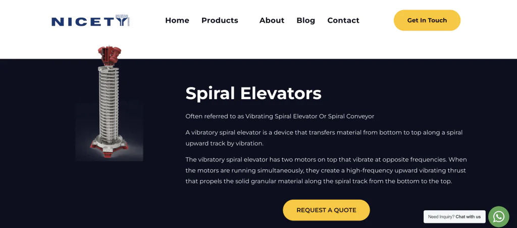 Comparing elevator efficiency, the vibrating spiral elevator’s initial cost might be higher. However, considering spiral elevator economics over time, it’s more cost-effective due to less maintenance and higher energy efficiency.
